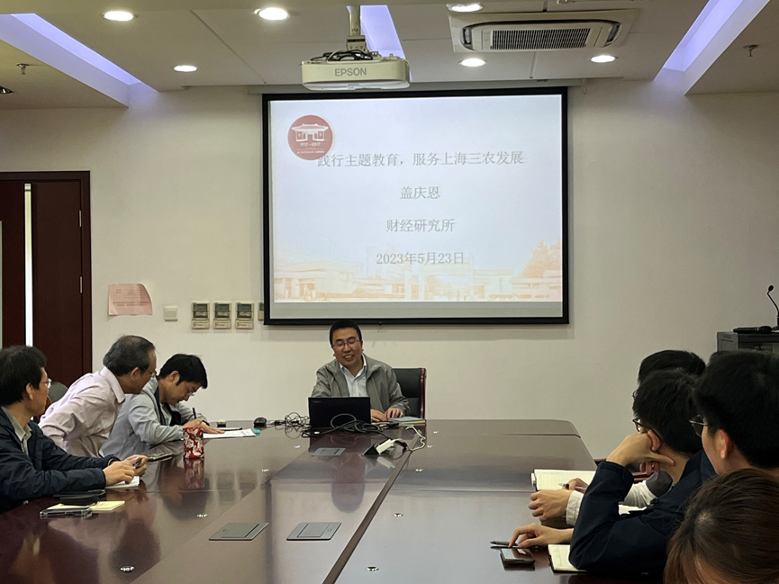 随后,纪检委员盖庆恩以“践行主题教育,服务上海三农发展”为主题,为全体师生党员带来了生动精彩的领学。盖庆恩同志首先提出了调查研究是理论联系实际的桥梁和纽带,调查研究是践行党的群众路线的生动载体。必须在调查研究中提高工作本领,把党的伟大自我革命进行到底。接着,盖庆恩同志以实际调研中破解上海“三农”问题,实现农民增收为具体案例,提出调查研究必须做到问计于民、问需于民,从而有针对性精准施策、分类增收。最后,盖庆恩同志强调,通过主题教育,全体师生党员要更好掌握调查研究技能,把这项技能贯穿在学习工作中,提高服务上海三农发展的能力。