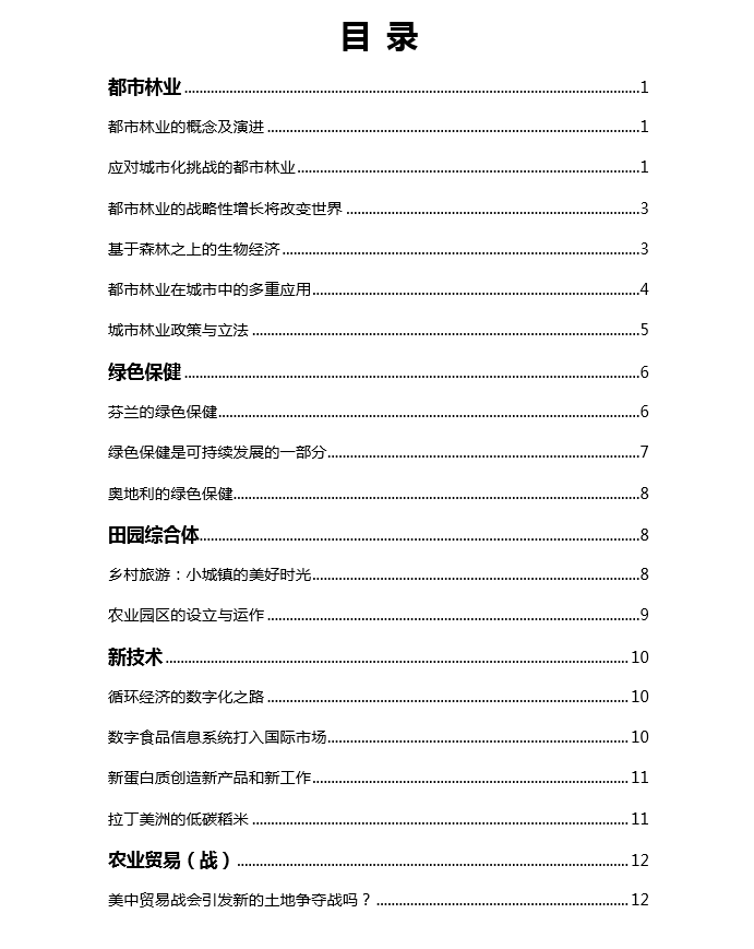 本期主题有“都市林业”、“绿色保健”与“田园综合体”及“农业新技术”等,随着城市化的不断发展,都市林业政策与应用愈发受到挑战,必须切实采取战略性行动。绿色保健与田园综合体正成为乡村经济发展的新形式与新业态,芬兰与奥地利等国的经验可资借鉴;另外,中美贸易战可能引发全球新的土地争夺,改革当前的粮食体系愈加迫切!