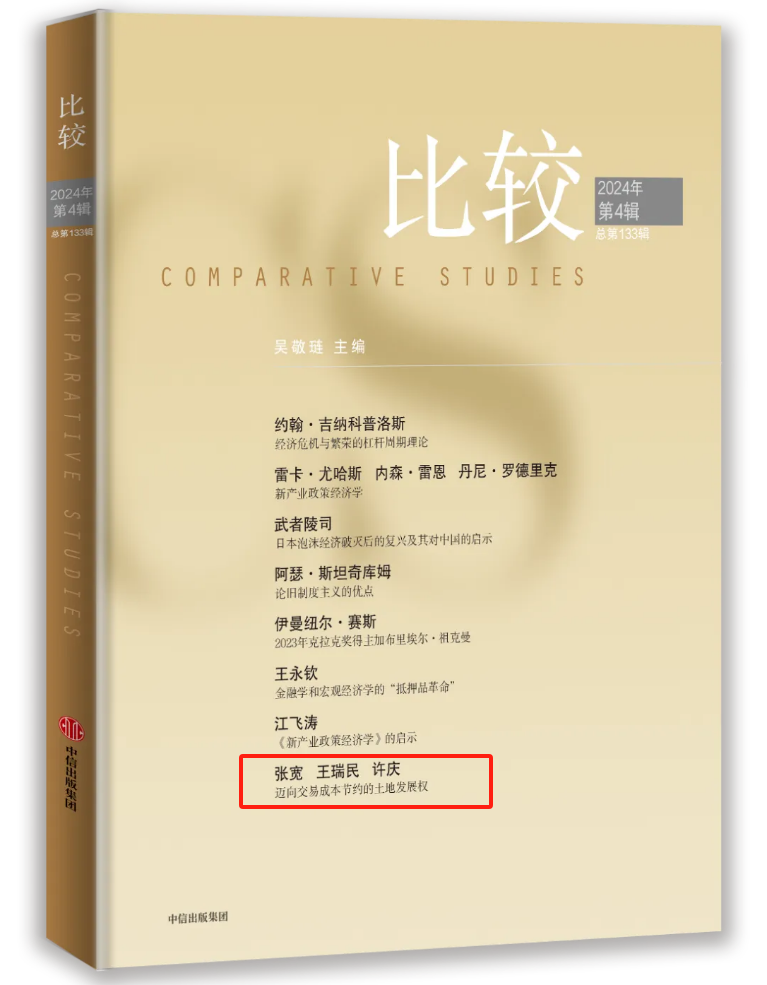 近期,上海财经大学城乡发展研究院副院长许庆教授团队合作的论文“交易成本节约与中国式土地发展权:理论逻辑、现实选择与下一步改革”发表于《比较》(2024年第4期)。城乡发展研究院许庆教授为第三作者,博士研究生张宽为第一作者,国务院发展研究中心王瑞民副研究员为第二作者。