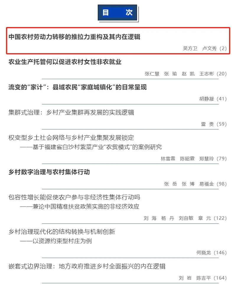 2024年11月21日,上海财经大学城乡发展研究院院长吴方卫教授团队合作的论文“中国农村劳动力转移的推拉力重构及其内在逻辑”发表于《中国农村观察》(2024年第6期)。吴方卫教授为论文第一作者,2021级博士生卢文秀为通讯作者。